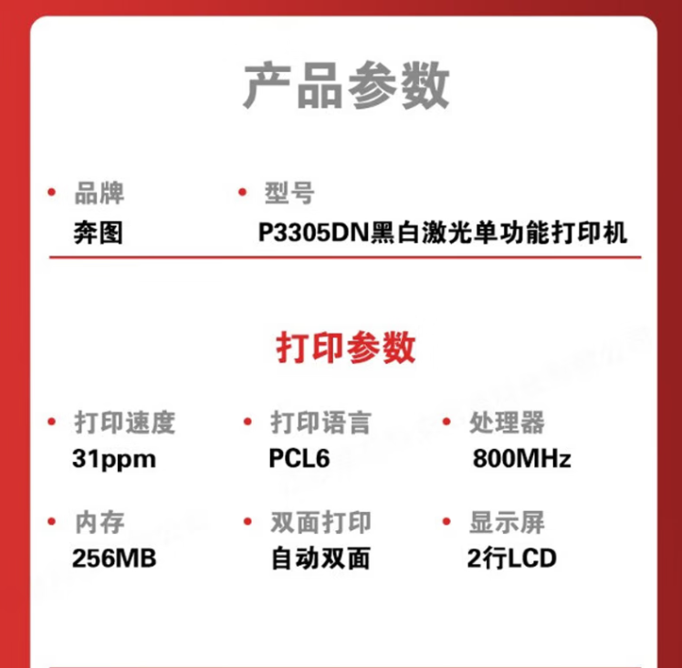 參數(shù) [品牌] 奔圖 [型號(hào)] P3305dn [毛重] 6.8KG